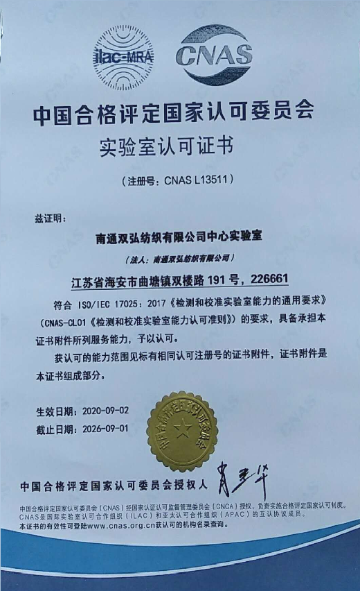 Kamakailan lamang, matagumpay na nakuha ng Central Laboratory ng Nantong Double Great Textile Co, Ltd. (CNAs) at iginawad sa isang sertipiko. Ito ay isa pang mahalagang kwalipikasyon na nakuha ng laboratoryo matapos maging sinulid na platform ng pagsubok ng China Cotton Textile Association. Ang Central Laboratory of Double Great Company ay naging isa rin sa mga advanced na laboratoryo ng mga natitirang cotton spinning enterprise sa bansa.