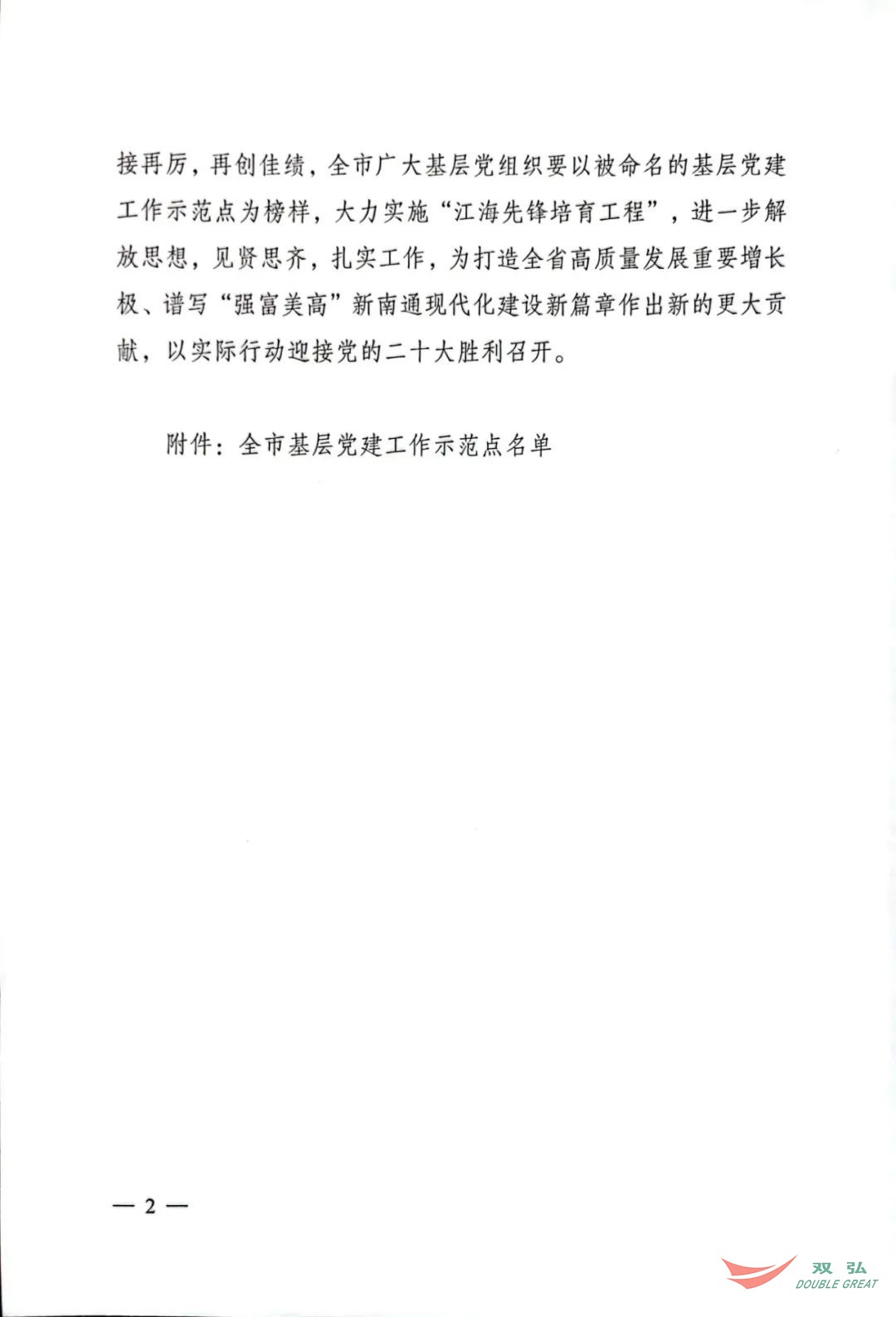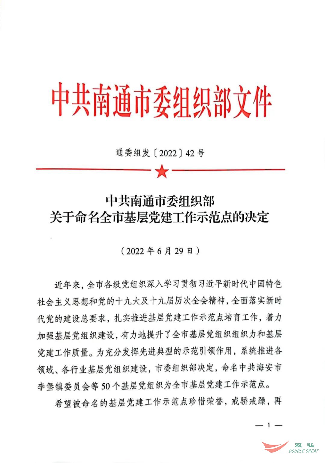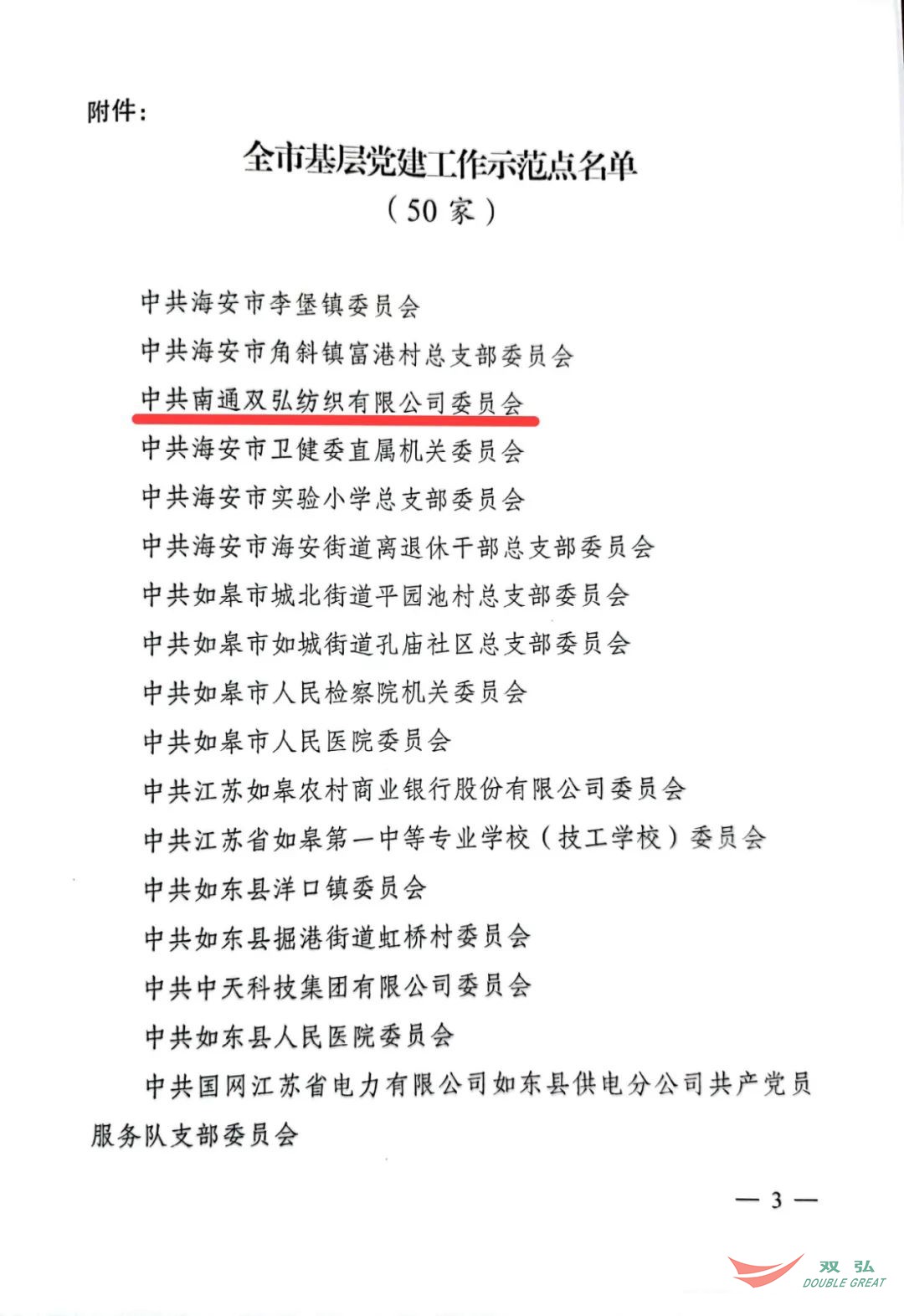 Kamakailan lamang, ang Kagawaran ng Organisasyon ng CPC Nantong Municipal Committee ay naglabas ng isang dokumento na nagngangalang 50 mga organisasyon ng partido ng mga katutubo bilang mga site ng demonstration party ng lungsod. Ang Komite ng Partido ng Nantong Double Great Textile Co, Ltd ay iginawad sa pamagat ng "The City's Grassroots Party Building Demonstration Site".